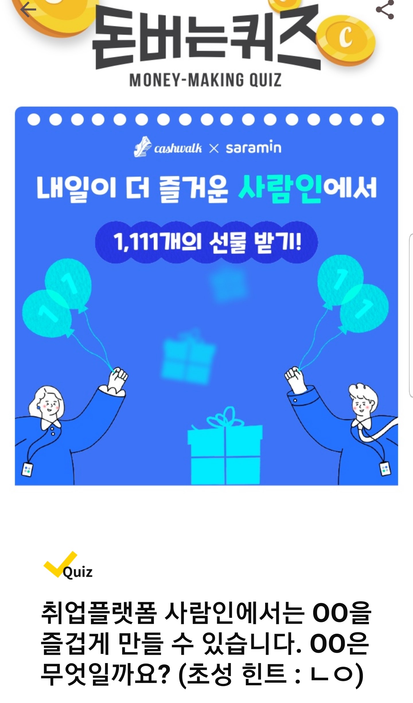 캐시워크 돈버는 퀴즈 11시 퀴즈가 공개되었습니다~